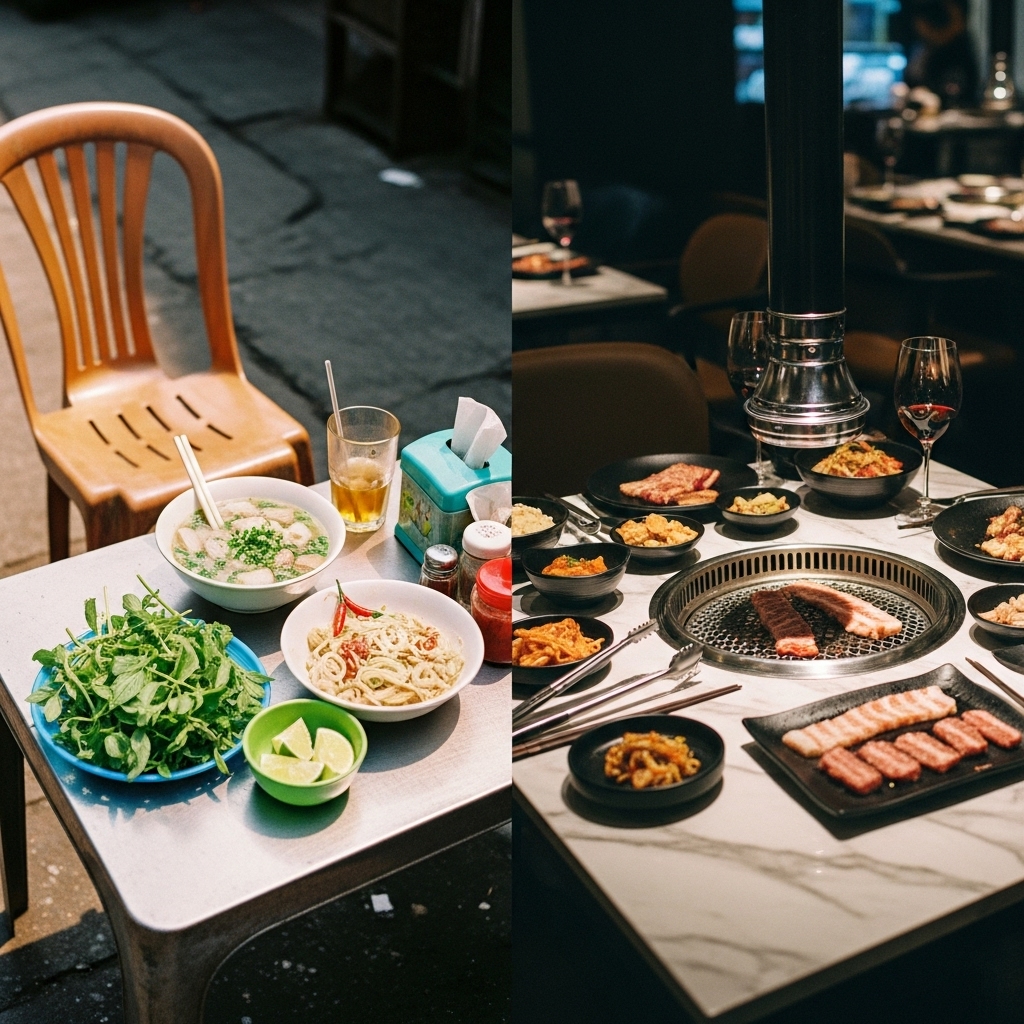 베트남의 로컬 음식은 여전히 놀라울 정도로 저렴합니다. 길거리 목욕탕 의자에 앉아 먹는 쌀국수나 껌땀(깨진 쌀밥)은 한국의 김밥 한 줄 가격보다 저렴합니다. 반면, 에어컨이 시원하게 나오고 위생이 검증된 한식당이나 고급 레스토랑은 한국 물가와 진배없거나 오히려 비쌀 때도 있습니다.